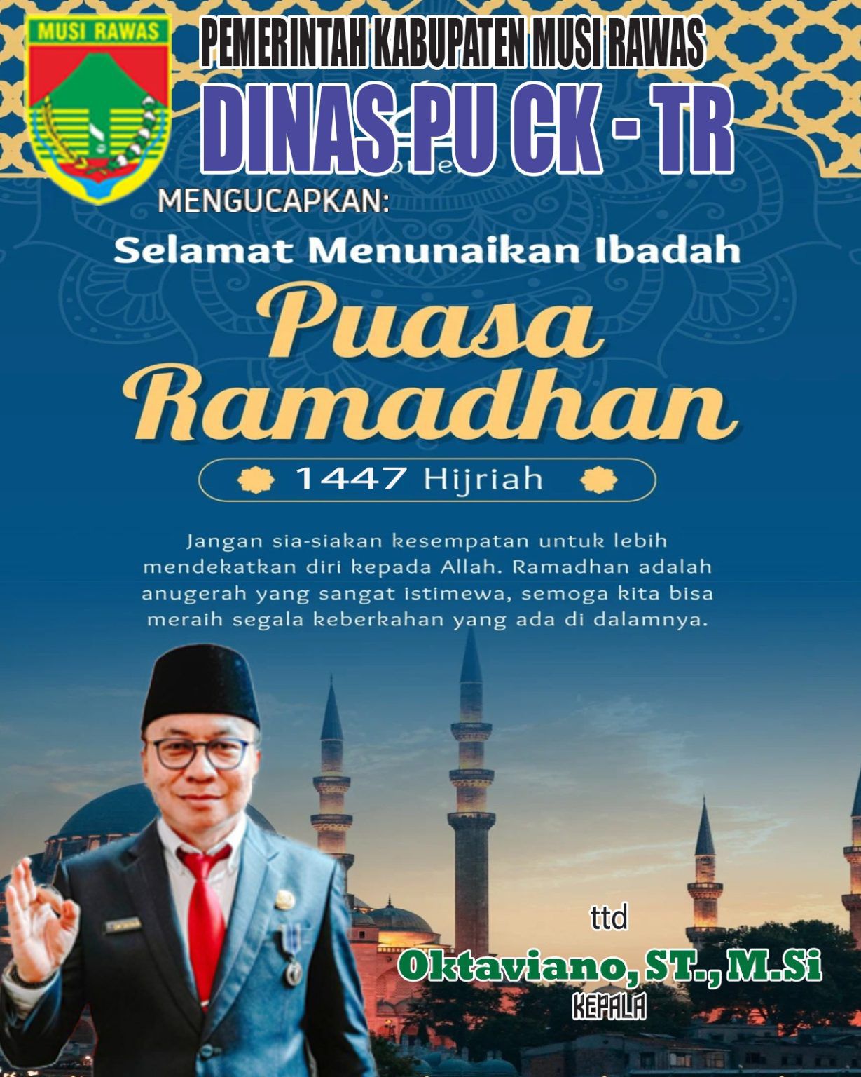 Ucapan tersebut disampaikan langsung oleh Kepala Dinas PUCK-TRP Kabupaten Musi Rawas, Dr. Oktaviano, S.T., M.Si., pada Rabu (18/2/2026).