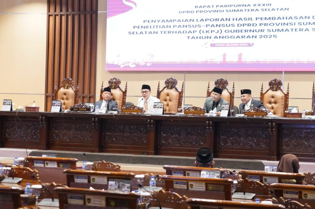 PALEMBANG — DPRD Provinsi Sumatera Selatan menggelar Rapat Paripurna XXXIII dengan agenda penyampaian laporan hasil pembahasan lima Panitia Khusus (Pansus) terhadap Laporan Keterangan Pertanggungjawaban (LKPJ) Gubernur Sumsel Tahun Anggaran 2025, Senin (20/4/2026).